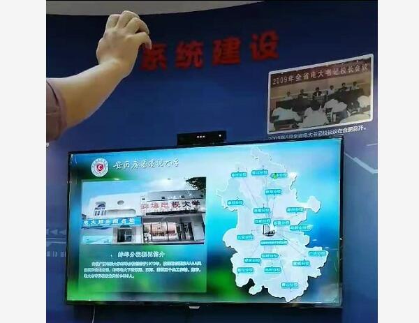 體感互動,設備識別手勢操作,來操控觸摸設備,讓人體驗隔空遠距離來互動體驗設備。展現(xiàn)出展廳的科技感。