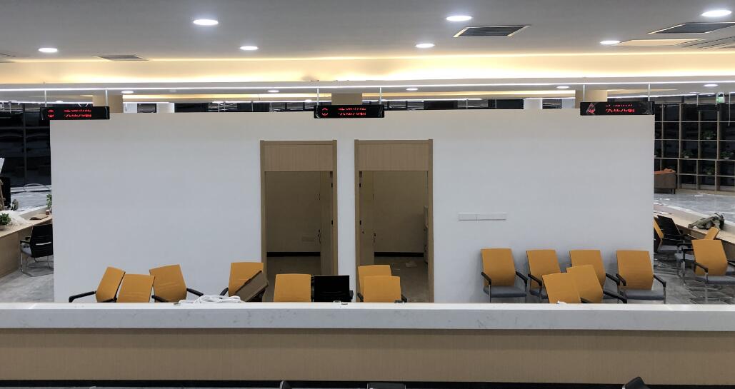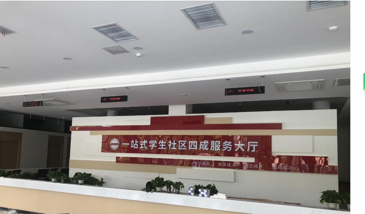 安慶師范大學一站學生社區辦事區域為環形設計,為此我司為學生社區中心設計在大廳入口處設置1臺22寸取號機,供來學生取號辦事,在環形工位的上方設計單行8漢字的窗口屏來顯示窗口辦理的業務,并且工位會配備1臺呼叫器;在靠近等候區的辦公區域設置了1臺43寸顯示屏,展示綜合叫號信息,也和環形區域的功放喇叭在看的同時也可以通過聽來查看排隊信息。